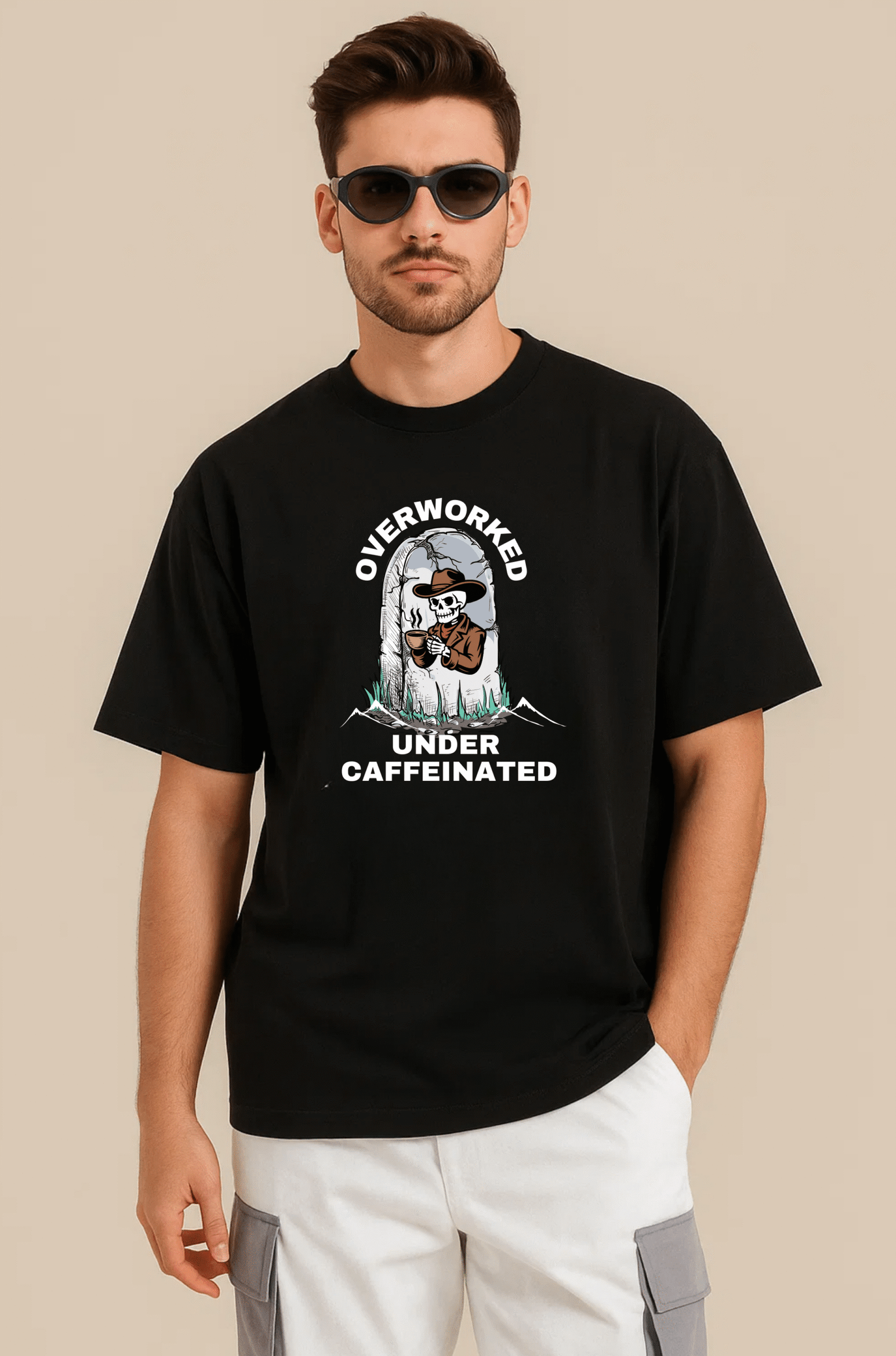 Fuel your grind and your sense of humor with our “Overworked Under Caffeinated” Oversized T-Shirt. Featuring a bold graphic of a skeleton cowboy clutching his much-needed coffee, this design perfectly captures the daily struggle of being tired but still pushing through.